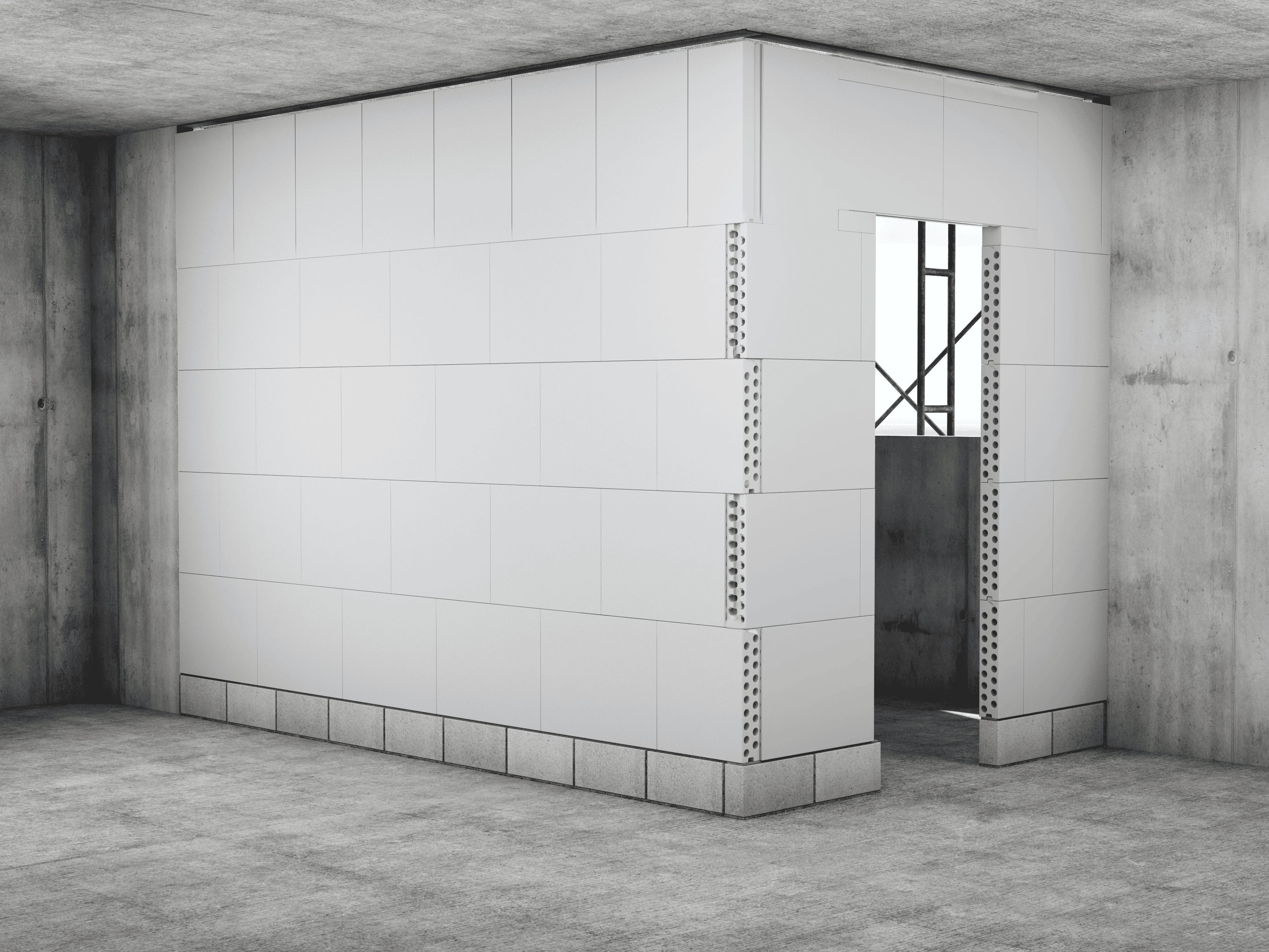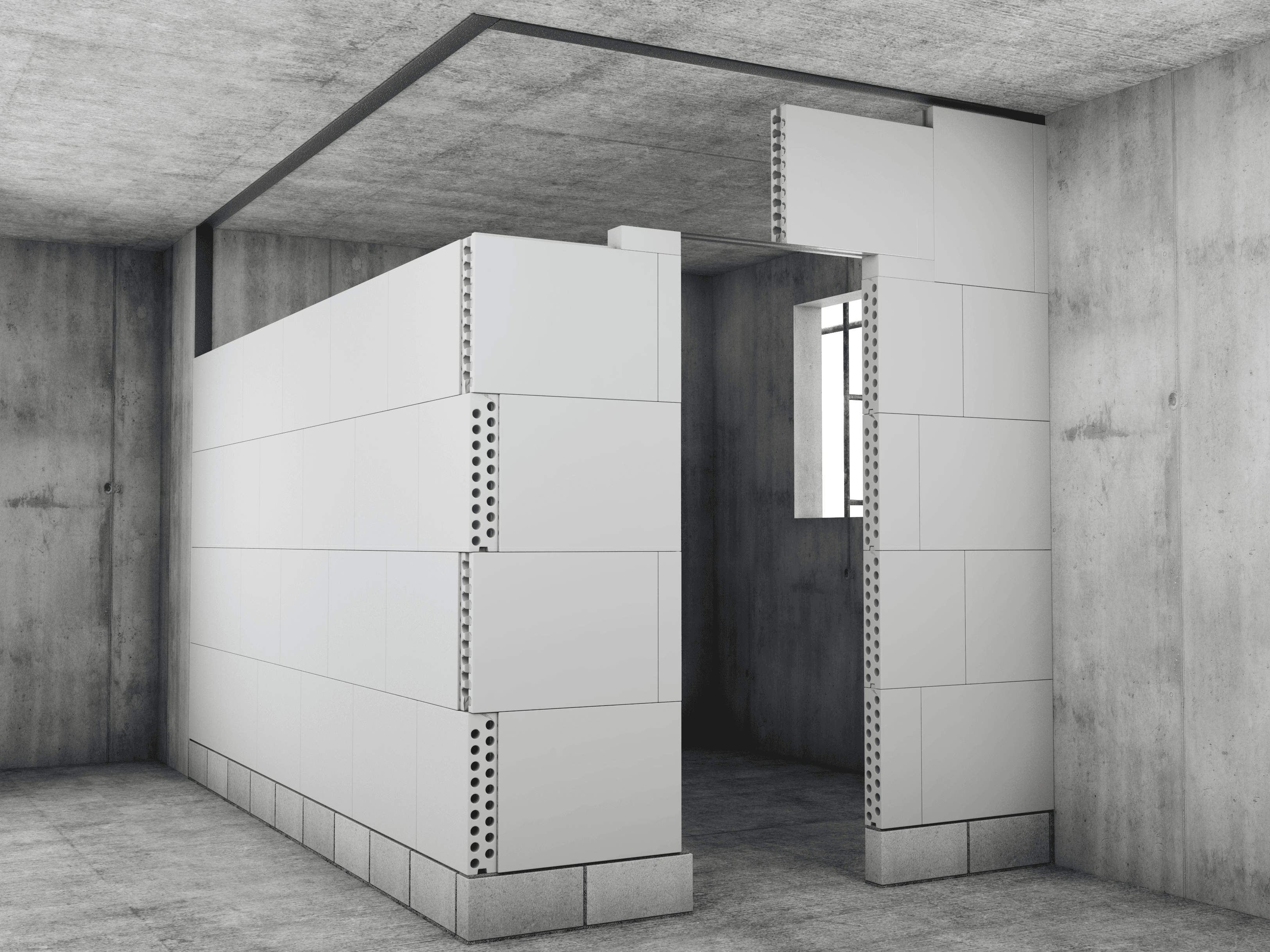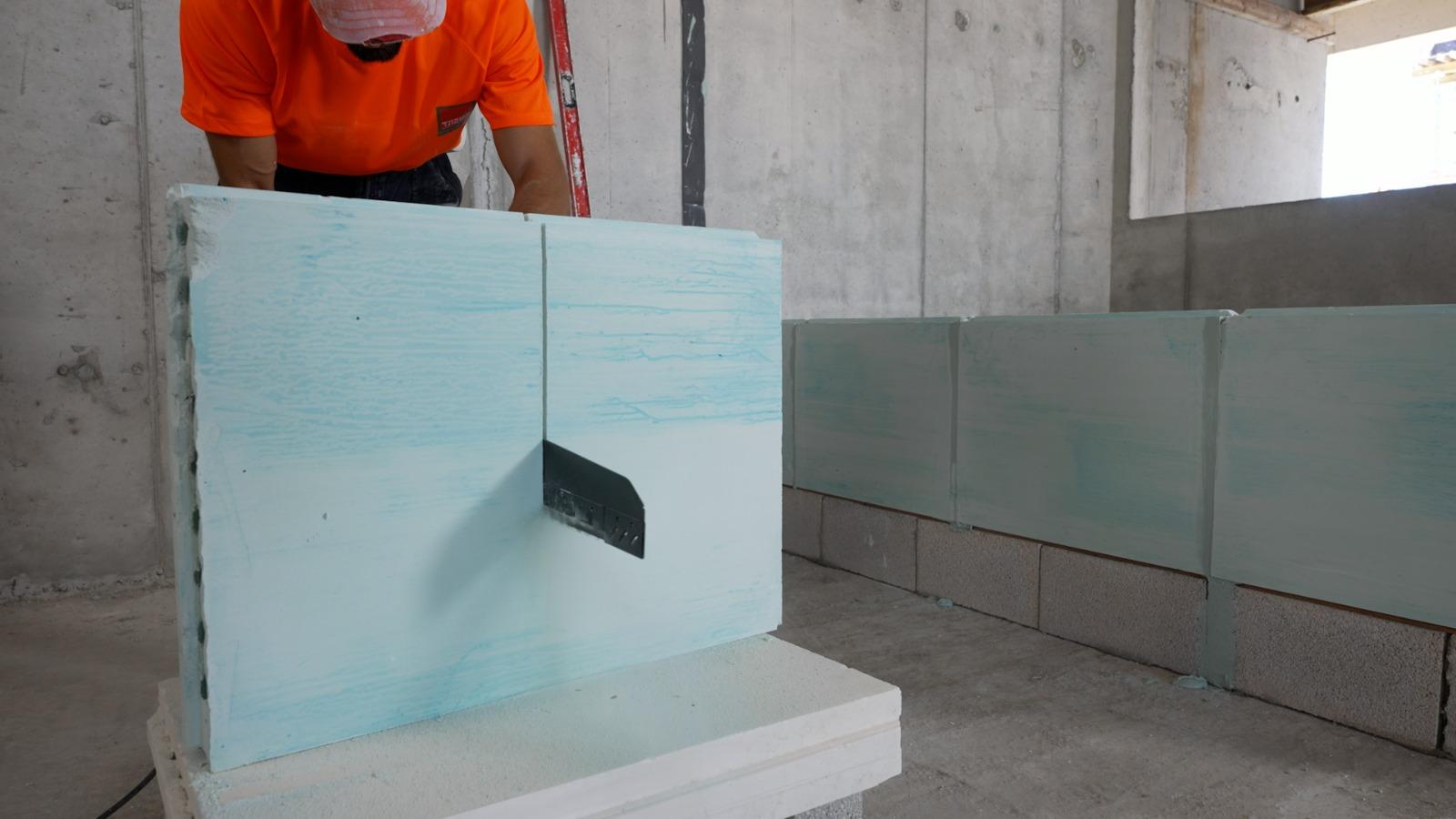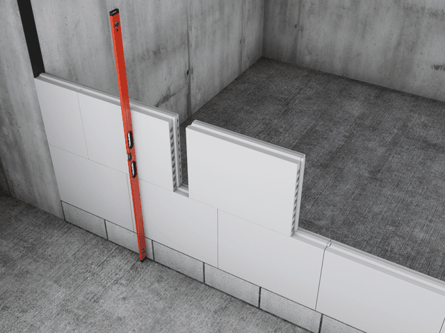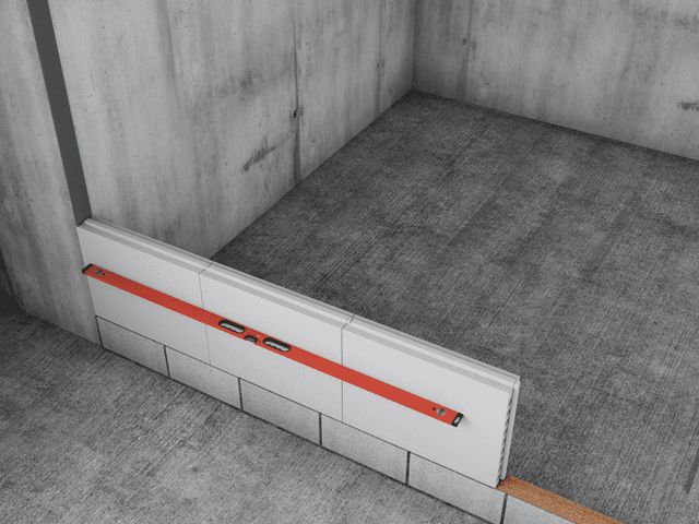 התחילו בניסור חצי בלוק שיונח על הבלוק השלם הראשון בשורה התחתונה. מרחו טיט אשבונד על פס האיטום, על חלקו העליון של הבלוק שמתחת, ועל צידי הבליטה הטרפזית. הניחו את הבלוק בשורה השנייה בהתאמה למנגנון שקע-תקע, והצמידו לקיר. המשיכו להניח את הבלוקים תוך מריחת טיט על החיבורים האנכיים והאופקיים והקפידו על סטייה של לפחות 20 ס"מ בין המישקים האנכיים בשורות. לחצו היטב את הבלוקים זה לזה, השתמשו בעודפי הטיט למילוי והחלקה ראשוניים, ובדקו די פעם את המישוריות והאנכיות של המחיצה. יש למלא את המרווח בין הבלוקים לקיר בטיט אשבונד ולהחליקו לפני התקשות סופית.