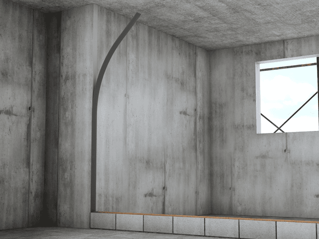 להשלמת המחיצה, הדביקו פס איטום שטוח לתקרה באמצעות טיט אשבונד. התאימו את גובה הבלוק האחרון כך שיישאר מרווח של 3.5 ס"מ מתקרת הבטון, על מנת לאפשר את הכנסת הבלוק והחדרת טיט בין הבלוק לפס האיטום. לאחר הנחת השורה האחרונה, סתמו את המרווחים בצידי הבלוק בטיט אשבונד, וצרו חריץ מבוקר בעומק 2 מ"מ לאורך המחיצה, סמוך לתקרה. בשלב הגמר, יש להדביק סרט שריון או רשת אינטרגלס לקבלת חיבור חלק ואחיד.